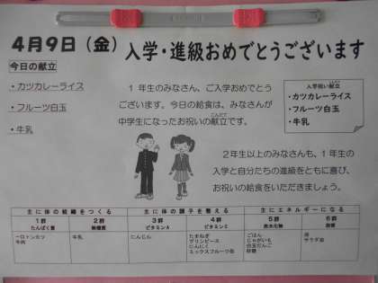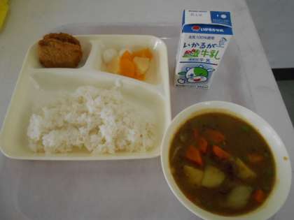 本日の献立は、カツカレーライス、フルーツ白玉、牛乳です。1年生の入学を祝っての、お祝い献立となっています。
