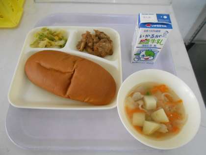 本日の献立は、黒糖パン、豚肉のデミグラスソース、スープ、牛乳です。