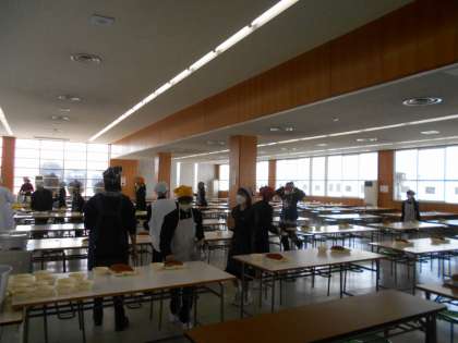 (写真は、昼食ホールでの1年生の給食準備の様子です。)