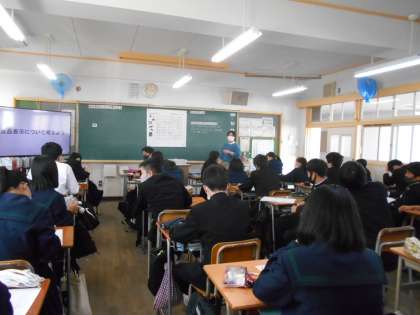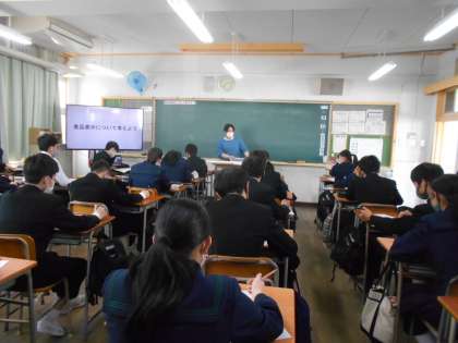 学習のテーマは、「食品表示について考えよう」でした。特定原材料7品目や、特定原材料に準ずるもの21品目についての学習を中心に、食品に関わるアレルギーや賞味期限、消費期限についても学習を行いました。