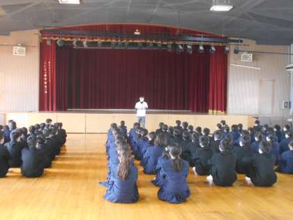 1年生の学年集会を講堂で行いました。山下先生から、住吉中学校で進めている「集団づくり」についてと「互いに違いを認め合う関係づくり」についてのお話がありました。