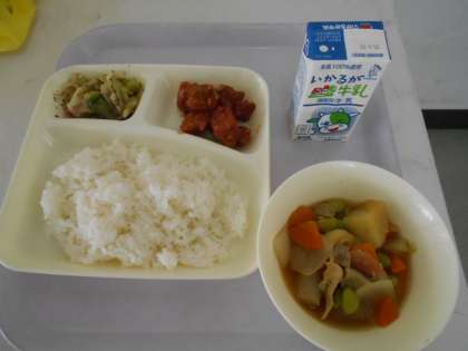 本日の献立は、ごはん、マグロのオーロラ煮、含め煮、キャベツの赤じそ和え、牛乳です。