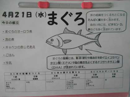 本日の献立で登場した「マグロのオーロラ煮」で使われている「マグロ」は、タンパク質が豊富な食材で、ビタミンⅮや鉄分もたくさん含まれています。