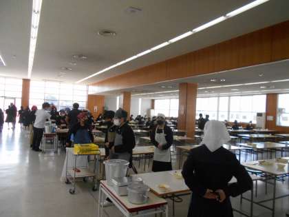 (写真は、昼食ホールでの1年生の給食準備の様子です。)