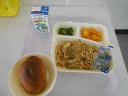 本日の献立は、黒糖パン、焼きそば、キュウリの生姜漬け、黄桃、牛乳です。