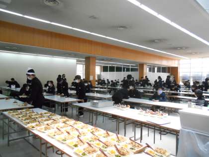 (写真は、昼食ホールでの2年生の給食準備の様子です。)