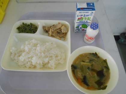 本日の献立は、ごはん、豚肉の生姜焼き、じゃこピーマン、みそ汁、発酵乳、牛乳です。