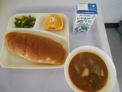 本日の献立は、おさつパン、ビーフシチュー、さんど豆とコーンのサラダ、あまなつかん、牛乳です。