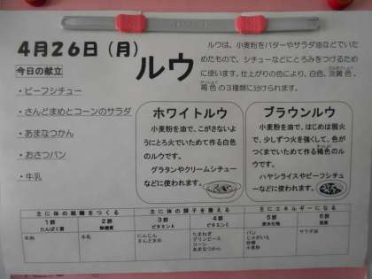 本日の献立に登場した「ビーフシチュー」では、とろみをつけるために「ルウ」が使われています。グラタンやクリームシチューにはホワイトルウが、ハヤシライスやビーフシチューにはブラウンルウが使われます。
