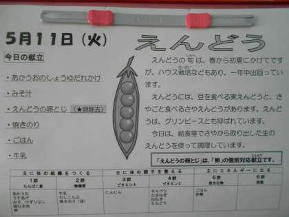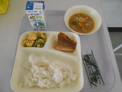 本日の献立は、ごはん、焼きのり、赤魚の醤油だれかけ、エンドウの卵とじ、みそ汁、牛乳です。本日の献立「エンドウの卵とじ」で使われている「エンドウ」は、春から初夏にかけてが旬とされている食材ですが、最近ではハウス栽培により一年中出回っています。。