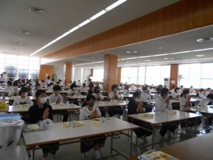 (写真は、昼食ホールでの1年生の給食の様子です。)