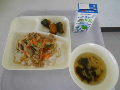 本日の献立は、豚丼、湯葉のすまし汁、かぼちゃの醤油焼き、牛乳です。