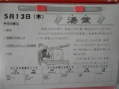 本日の献立「湯葉のすまし汁」で使われている食材の「湯葉」というのは、豆乳を煮たてて、表面にできた薄い膜を引きあげてつくられます。