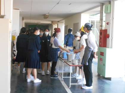 (写真は、3年生廊下での3年生の給食の様子です。)