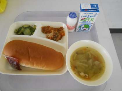 本日の献立は、コッペパン、イチゴジャム、ジャガイモのミートグラタン、キュウリのバジル風味サラダ、スープ、発酵乳、牛乳です。