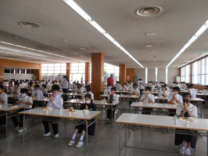 (写真は、昼食ホールでの1年生の給食の様子です。)