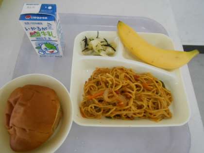本日の献立は、黒糖パン、カレースパゲッティ、キャベツのひじきドレッシング、バナナ、牛乳です。