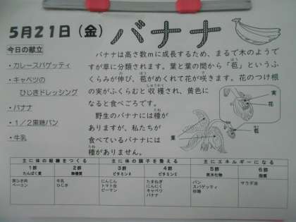 本日の献立に登場した「バナナ」は、高さ数mまでに及ぶ植物ですが、分類としては草となり、花のつけ根が膨らんで収穫され、黄色になる頃が食べごろとなります。