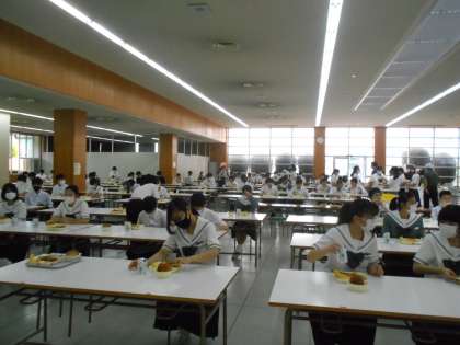 (写真は、昼食ホールでの2年生の給食の様子です。)