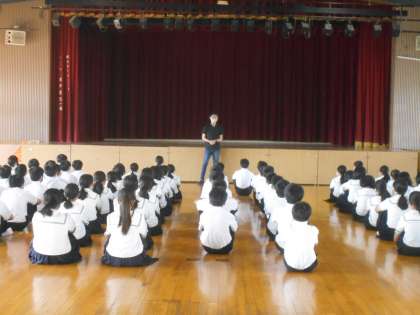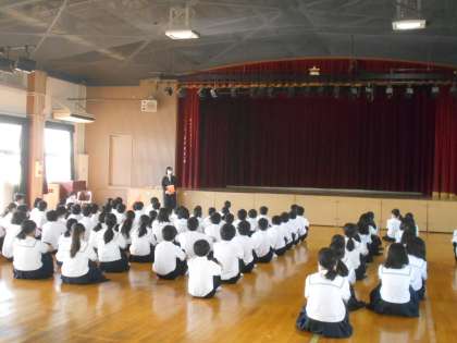 1年生の学年集会を講堂で行いました。岡田先生からは、夏服への完全更衣のお話が、炭谷先生からは「思いやり」についてのお話がありました。