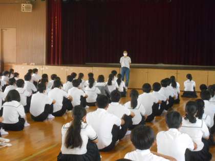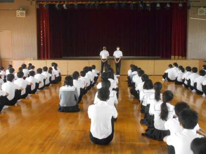 3年生の学年集会を講堂で行いました。代議員からの報告があり、姜先生からは、「ルールを守ること」と「協力することの意義」について、3年生として意識を高くもってほしいというお話がありました。