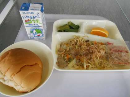 本日の献立は、黒糖パン、和風ヤキソバ、オクラの甘酢あえ、オレンジ、牛乳です。