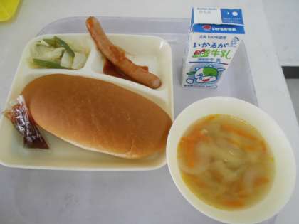 本日の献立は、コッペパン、イチゴジャム、ウインナーのケチャップソース、キャベツとさんど豆のサラダ、スープ、牛乳です。