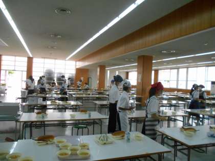 (写真は、昼食ホールでの1年生の給食準備の様子です。)