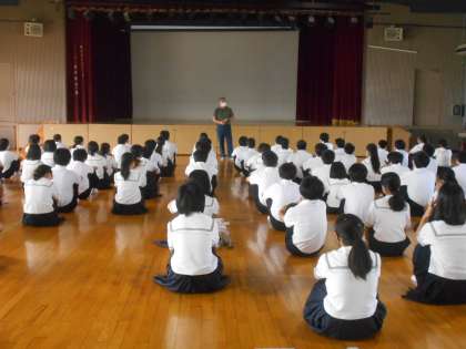 2年生の学年集会を講堂で行いました。木村先生から、主体的に考えて行動することの大切さについてのお話がありました。