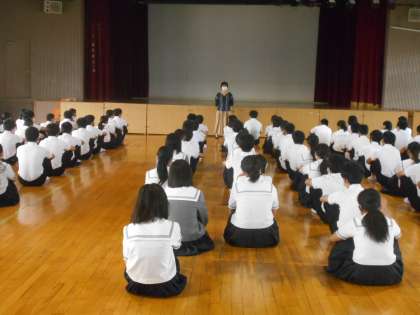 3年生の学年集会を講堂で行いました。葉金先生から、3年生としての自覚と意識して行動することの大切さについてのお話がありました。