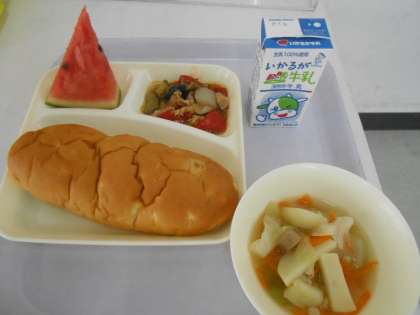 本日の献立は、おさつパン、鶏肉と夏野菜のソテー、押麦のスープ、スイカ、牛乳です。