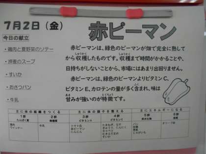 本日の献立「鶏肉と夏野菜のソテー」で使われた食材である「赤ピーマン」は、緑色のピーマンが畑で完全に熟してから収穫されたもので、ビタミンCやビタミンE、カロテンなどを豊富に含み、甘みの強い味が特徴です。