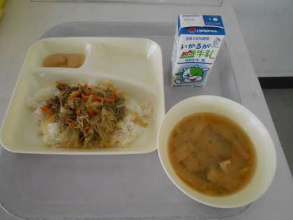 本日の献立は、牛丼、白花豆(しろはなまめ)の煮物、冬瓜(とうがん)のみそ汁、牛乳です。