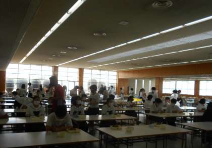 (写真は、昼食ホールでの2年生の給食準備の様子です。)