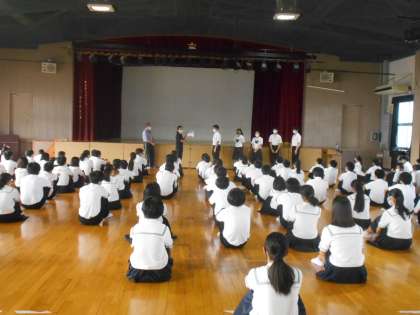 2年生の学年集会を講堂で行いました。英語科の小テストパーフェクト賞の表彰が行われました。