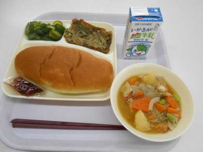 本日の献立は、コッペパン、もずく入りヒラヤーチー、豚肉と厚揚げの煮物、あっさりきゅうり、牛乳です。