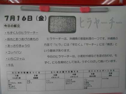 本日の献立で登場した「もずく入りヒラヤーチー」の「ヒラヤーチー」は、沖縄県の家庭料理で、沖縄の方言で「ヒラ」は平たく「ヤーチー」は焼きという意味だそうです。