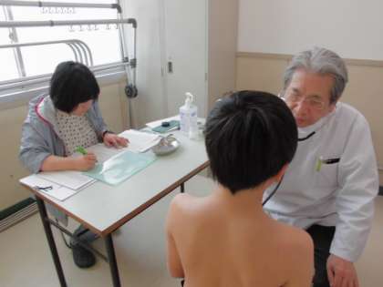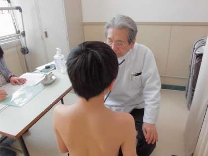 脊柱検査や聴診器での呼吸音・心音を調べていただきました。