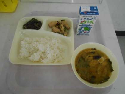 本日の献立は、ごはん、焼き鳥、ナスのそぼろ炒め、みそ汁、牛乳です。
