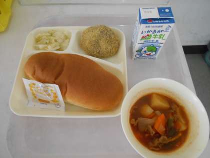 本日の献立は、コッペパン、マーマレード、チキンレバーカツ、ケチャップ煮、キャベツのバジル風味サラダ、牛乳です。