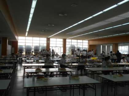 (写真は、昼食ホールでの2年生の給食準備の様子です。)
