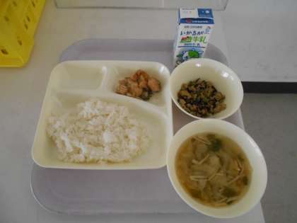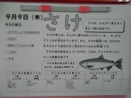 本日の献立は、ごはん、鮭のしょう油風味焼き、高野豆腐の炒り煮、五目汁、牛乳です。本日の献立に登場した「鮭のしょう油風味焼き」で使われる「鮭」は、タンパク質が豊富に身に含まれていて、ビタミンB1、B2なども含まれ、脂肪にはDHAやEPAという成分が含まれています。