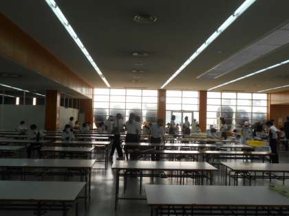 (写真は、昼食ホールでの2年生の給食準備の様子です。)