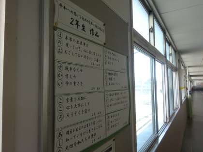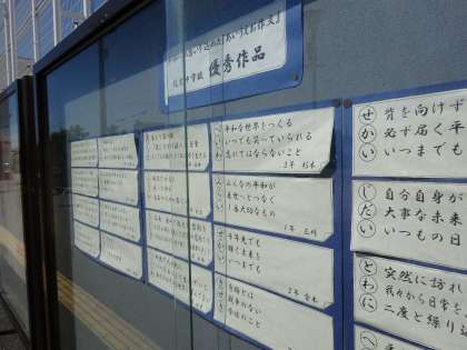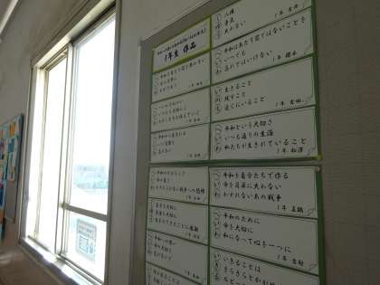8月6日の平和人権登校日に行った“平和への思いを込めた『あいうえお作文』”を掲示板(優秀賞)と各学年の廊下に掲示にしました。
