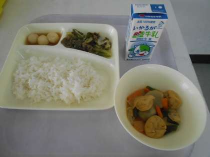 本日の献立は、ごはん、牛肉と野菜の炒めもの、一口がんもと里芋の味噌煮、みたらし団子、牛乳です。
