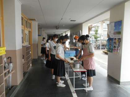 (写真は、3年生廊下での3年生の給食準備の様子です。)