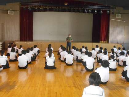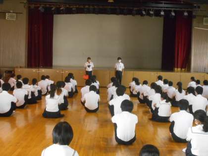 2年生の学年集会を講堂で行いました。生徒専門委員会からの報告が行われ、木村先生からは文化祭に向けての取り組みについての話がありました。