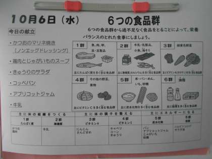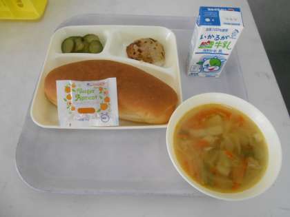 本日の献立は、コッペパン、アプリコットジャム、カツオのマリネ焼き、キュウリのサラダ、鶏肉とジャガイモのスープ、牛乳です。