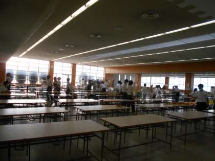 (写真は、昼食ホールでの2年生の給食準備の様子です。)