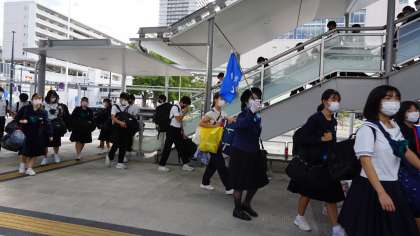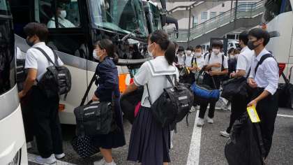 クラスごとにバスに乗車して、晴海親水公園に向けて出発です。